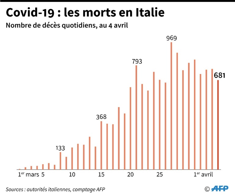Selon le bilan quotidien, 681 personnes ont perdu la vie en 24 heures en Italie, un chiffre toujours impressionnant mais lui aussi en baisse, de plus de 10% par rapport à vendredi (766).