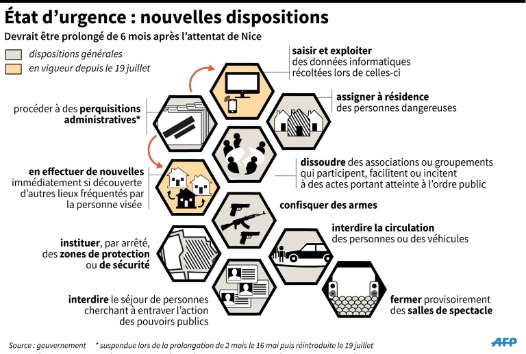 Une prolongation de trois mois avait été décidée par François Hollande quelques heures après l'attaque au camion, revendiquée par l'organisation Etat islamique, ayant fait 84 morts et 300 blessés le 14 juillet à Nice sur la Promenade des Anglais.