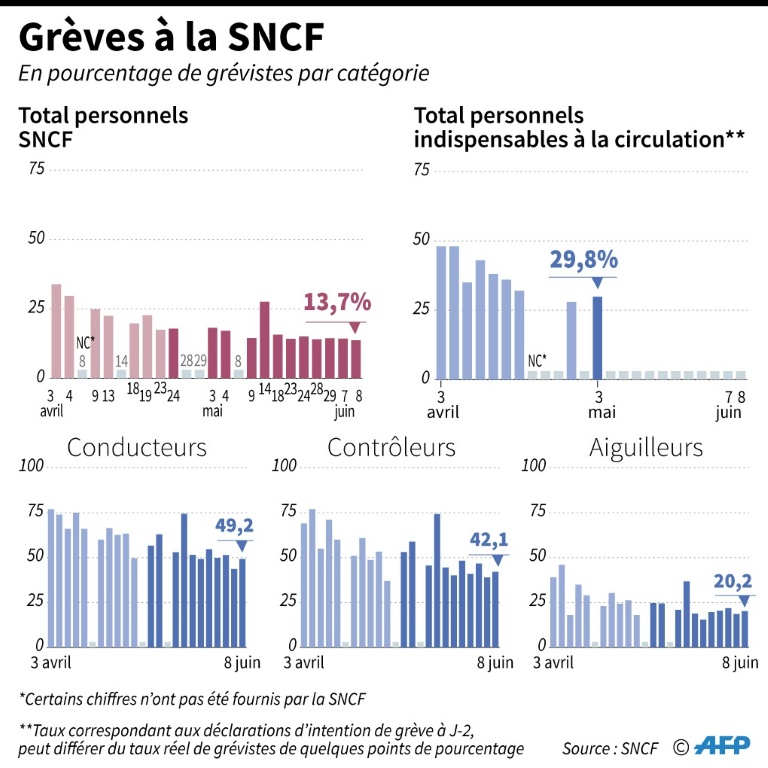 En plus des deux nouveaux épisodes de grève déjà prévus, mardi et mercredi, puis dimanche et lundi, l'intersyndicale de la SNCF composée du quatuor CGT, Unsa, SUD et CFDT organise mardi une "journée de la colère cheminote", espérant une "participation massive à la grève unitaire" pour maintenir "la pression" sur le gouvernement et le patronat du rail.Ils espèrent rééditer le sursaut observé lors de la "journée sans cheminot" du 14 mai, quand près de 28% du personnel (chiffre SNCF) avait cessé le travail, contre moins de 15% une semaine plus tôt. Depuis lors, la mobilisation a oscillé entre 15,74% et 13,68%, taux le plus bas.