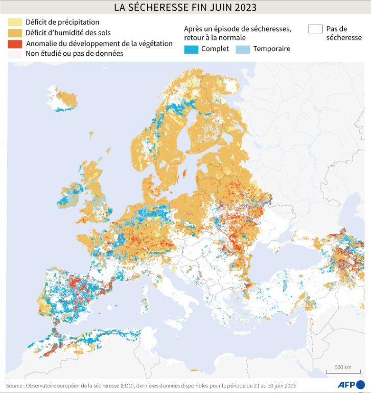 Cette sécheresse ne concerne pas que la France: près de la moitié de l'Europe et du pourtour méditerranéen (49,2%) connaissaient déjà cette situation pour la période du 11 au 20 juin, selon l'European Drought Observatory (EDO). C'est un peu mieux que l'an dernier à la même époque (52,4%).