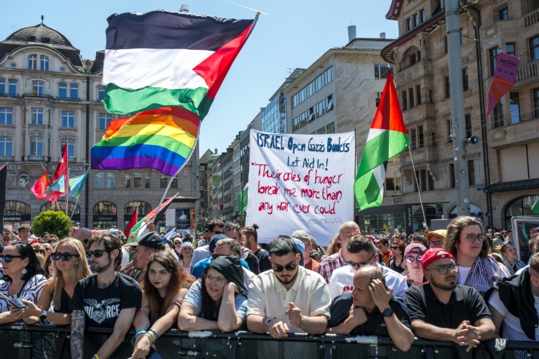 Au moment où le défilé démarrait devant l'Hôtel de ville emblématique de Bâle, vieux de 500 ans, une douzaine de drapeaux palestiniens étaient brandis dans la foule, l'un d'eux accroché au-dessus d'un drapeau arc-en-ciel, à côté d’une banderole : "Israël : ouvrez les frontières de Gaza. Laissez entrer l'aide."