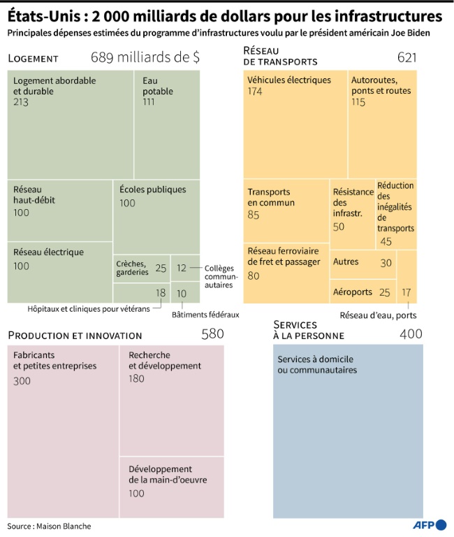 Tous ces investissements vont créer des emplois bien payés, martèle l'exécutif. Mais les négociations avec les républicains s'annoncent très difficiles. Le chef de la minorité républicaine au Sénat Mitch McConnell a promis jeudi de "combattre à chaque étape" le plan, qui prévoit "plus d'argent pour les voitures électriques que pour les routes et les ponts", a-t-il décrié.