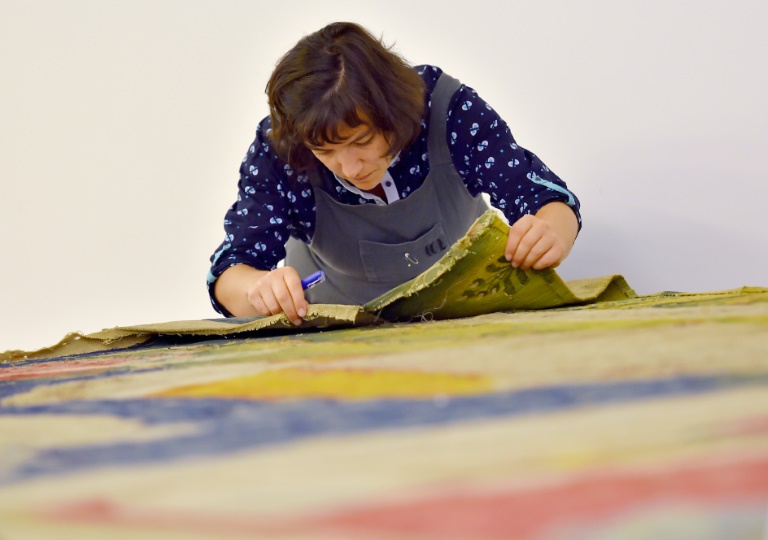 "L'envers ne raconte pas que sa beauté de couleurs, mais aussi les différentes interventions qui ont eu lieu. Ici, la partie a été retissée, là , on voit des techniques de repiquage avec de la laine neuve et des fils qui partent dans tous les sens", décrit Suzanne Bouret, penchée sur l??uvre, pendant que l'une de ses collègues passe l'aspirateur pour récolter la poussière et la peser.