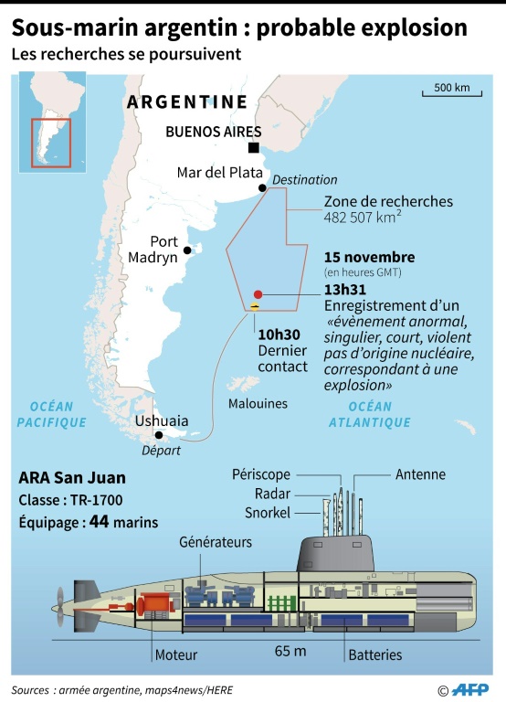 Le sous-marin militaire argentin San Juan a sombré dans l'Atlantique, probablement à la suite d'une explosion à bord le mercredi 15 novembre avec ses 44 membres d'équipage à bord.