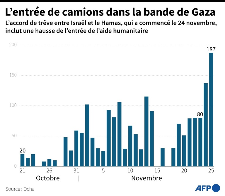 Si la trêve offre un répit à la population, les besoins sont "sans précédent" dans le territoire, où "200 camions par jour pendant au moins deux mois" seraient nécessaires, selon l'agence de l'ONU pour les réfugiés palestiniens (Unrwa).