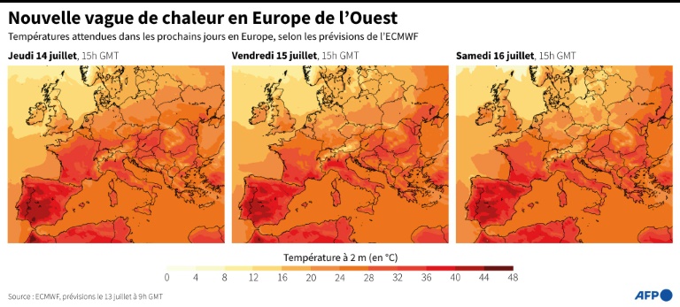 La vague de chaleur qui envahit le sud-ouest de l'Europe depuis plusieurs jours devrait atteindre un pic jeudi en Espagne, où le thermomètre a déjà dépassé les 45 degrés mercredi, et au cours du weekend en France, essaimant des incendies sur son chemin.