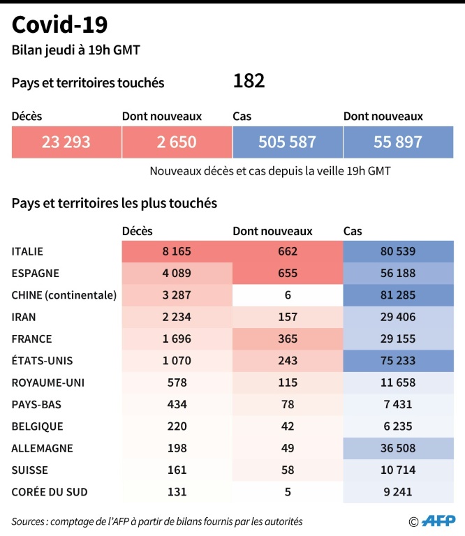 Concernant les décès, c'est l'Italie qui est en tête (plus de 8.000 morts), devant l'Espagne (plus de 4.000 morts) et la Chine (3.287 morts). Les Etats-Unis, avec 1.201 décès jeudi soir, se trouvaient en sixième position derrière l'Iran et la France.