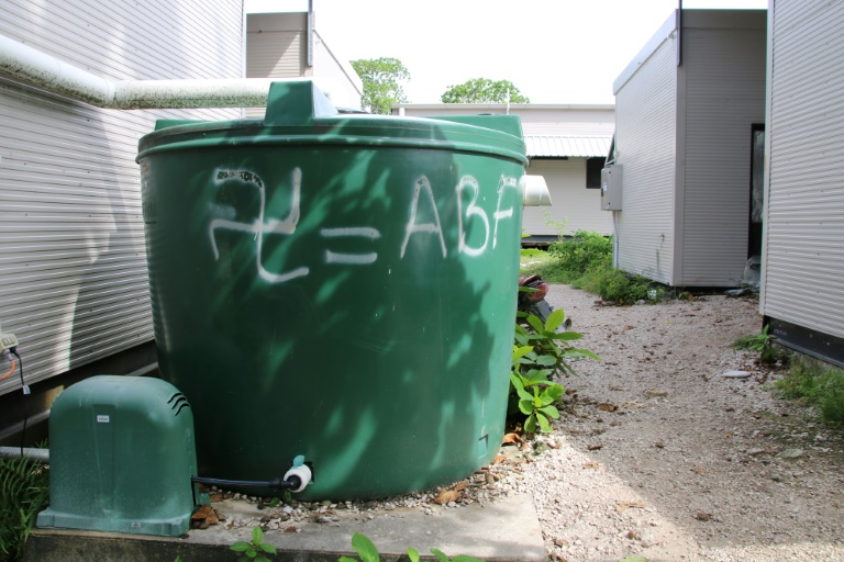 Non loin de là, entre deux préfabriqués, une cuve est taguée du sigle "ABF" et d'une croix gammée. L'Australian Border Force est le service australien de contrôle des frontières, honni par les réfugiés.