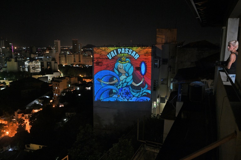 A défaut de le faire sur les murs des rues, la tagueuse brésilienne auto-confinée, Rafamon, projette sur grand écran une oeuvre qui décrète en couleurs: "Vai Passar" (Ca va passer).