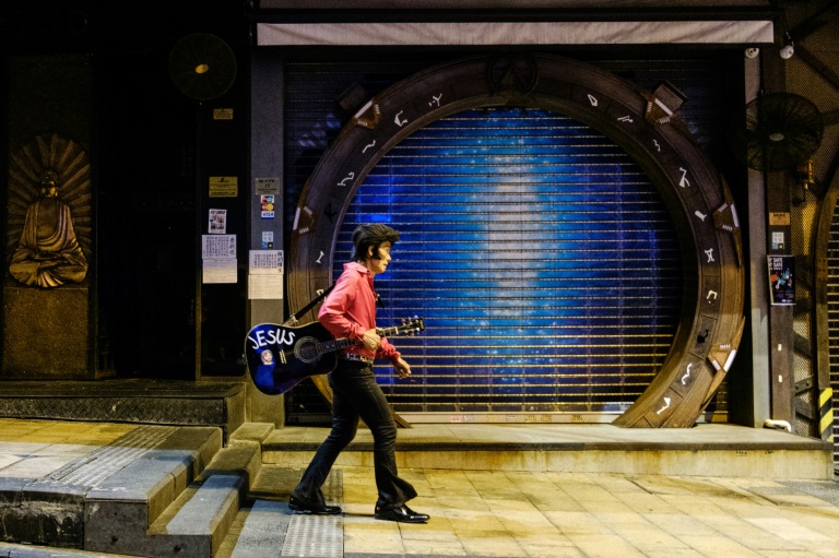 Plus personne dans le quartier des bars de Lan Kwai Fong, le chanteur hongkongais Kwok Lam-sang, 67 ans, surnommé Melvis pour son look et ses reprises d'Elvis Presley, est tout seul, sa guitare sur le dos.