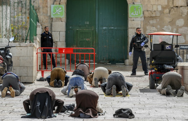 Des Palestiniens prient devant l?entrée de la mosquée Al-Aqsa, fermée par le Waqf, l?organisme qui gère les lieux saints musulmans dans la Ville Sainte.
