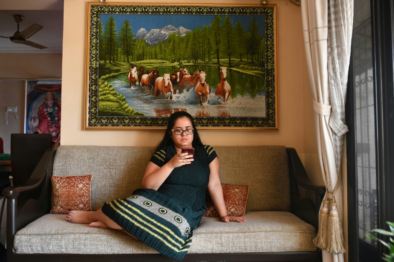 En télé-travail, l'indienne Diya RoyChowdhury, chargée des relations humaines dans une entreprise de Bombay, prend une pause sur son canapé.