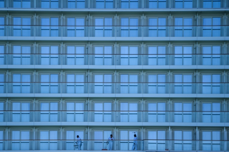 Au port, des employés de la Norwegian Cruise Line nettoient un bateau de croisière, dont plusieurs dans le monde ont été bloqués pour des cas suspects ou avérés de contamination du Covid-19.