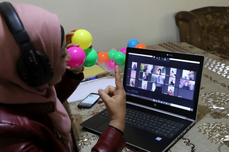 Avec la fermeture des écoles, l'enseignante palestinienne Jihad Abu Sharar, fait sa classe en ligne, depuis sa maison dans un village près de Hébron.