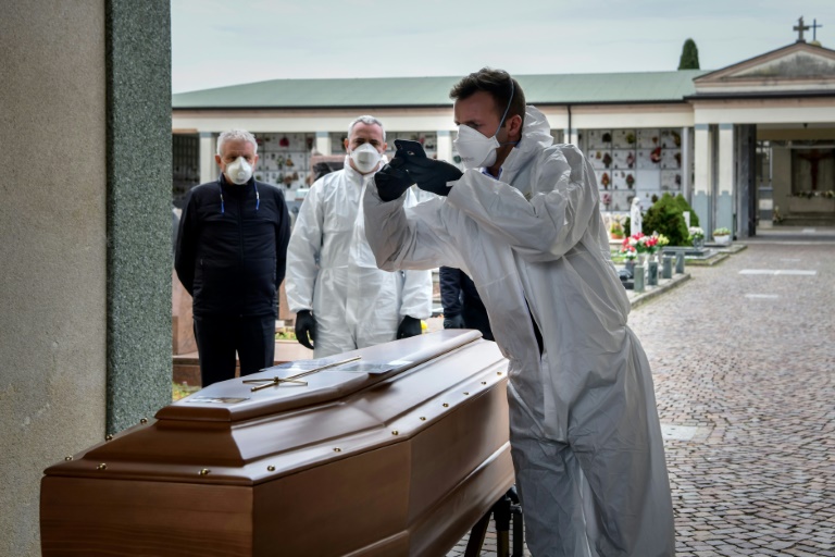 Enterrée seule, sans l'adieu des proches en quarantaine interdits de cimetière: en combinaison et masque de protection, un employé italien des pompes funèbres de la province de Bergame prend des photos du cercueil d'une personne décédée pour les envoyer à la famille.
