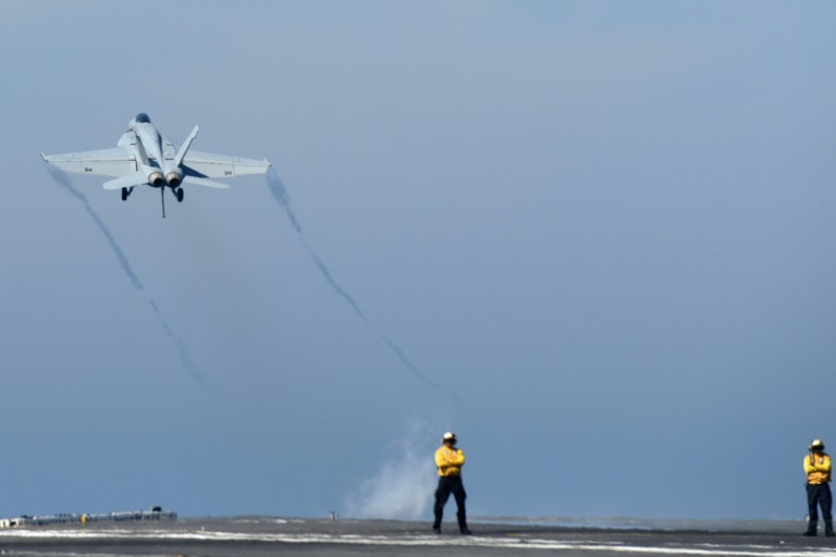 Un F-18 américain s'élance à plein régime, passant de 0 à 250 km/h en moins de deux secondes, tandis qu'un Rafale vient d'apponter, brutalement freiné dans sa course par un brin d'arrêt. "Pas un sport de masse", s'amuse un pilote français.