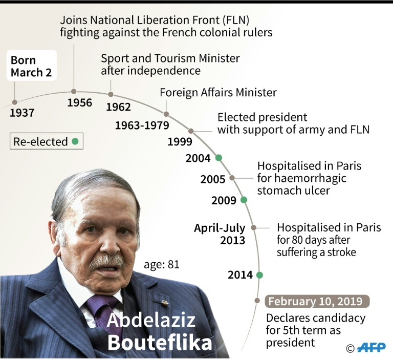 En annonçant le 10 février sa candidature à la présidentielle du 18 avril, le président Bouteflika, au pouvoir depuis 1999 et qui souffre des séquelles d'un accident vasculaire cérébral (AVC) depuis 2013, a mis fin à de longs mois d'incertitude mais aussi déclenché une contestation d'ampleur inédite en 20 ans et le visant directement, du jamais vu.