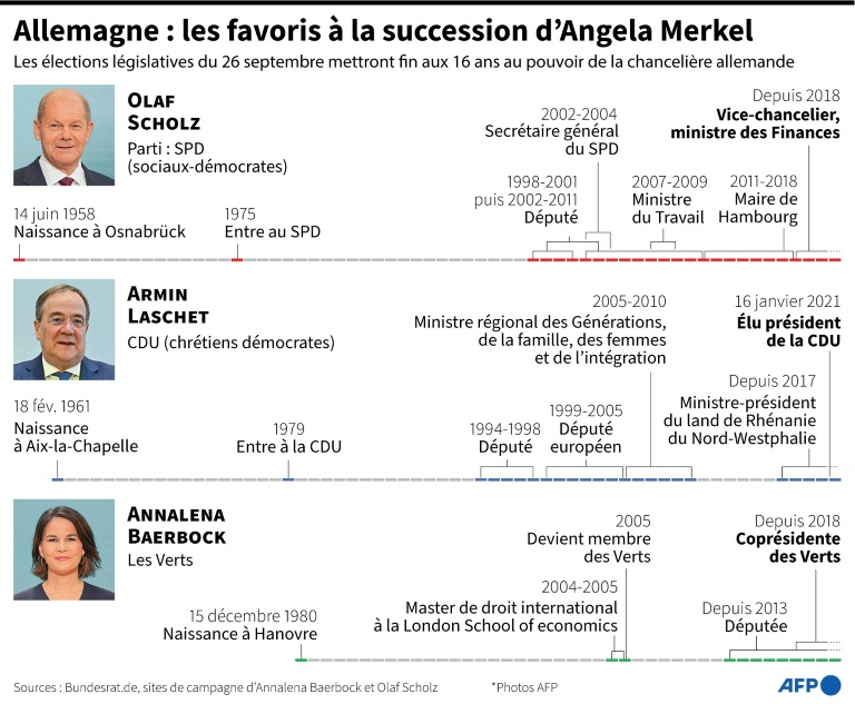 Leur cheffe de file Annalena Baerbock, 40 ans, a multiplié les couacs avant l'été, entre accusations de plagiat et primes non déclarées. Les Verts souhaitent participer au gouvernement, si possible avec les sociaux-démocrates. Pour la première fois depuis les années 1950, l'appoint d'un troisième parti devrait toutefois être nécessaire. Les libéraux du FDP apparaissent d'ores et déjà comme un potentiel "faiseur de roi". La gauche radicale Die Linke semble être prête à participer mais devra d'abord renoncer à ses critiques contre l'Otan. L'extrême droite AfD, entrée pour la première fois au Bundestag il y a quatre ans, devrait confirmer son ancrage parlementaire avec environ 10% mais reste exclue de toute coalition éventuelle.