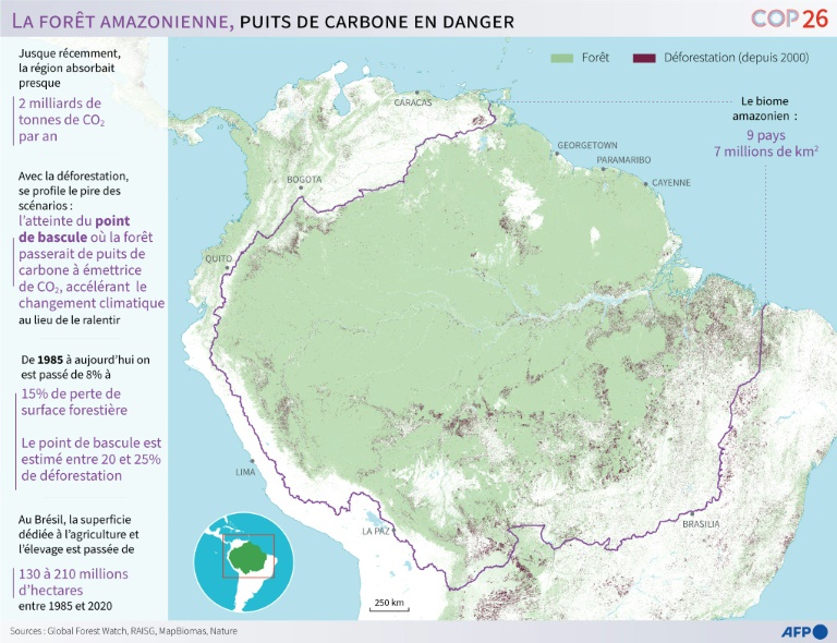 La majestueuse forêt aux trois millions d'espèces offre une végétation luxuriante qui absorbe d'énormes quantités de carbone grâce à la photosynthèse -- cruciale au moment où l'humanité lutte pour limiter les gaz à effet de serre qui réchauffent la planète. Alors que les émissions de dioxyde de carbone ont augmenté de 50% en 50 ans, dépassant les 40 milliards de tonnes dans le monde en 2019, l'Amazonie a absorbé une bonne part de cette pollution: presque deux milliards de tonnes par an, jusqu'à récemment.