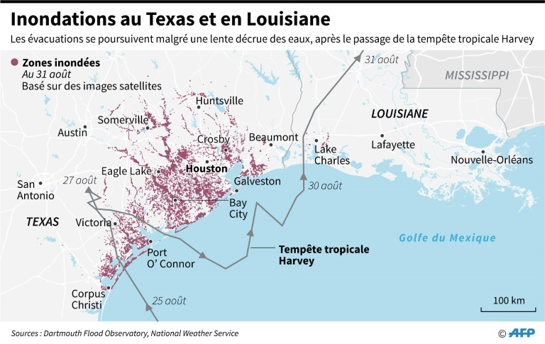 Le maire de Houston, Sylvester Turner, a appelé vendredi les habitants de quartiers inondés situés près de deux réservoirs à quitter cette zone qui pourrait rester encore deux semaines sous les eaux.