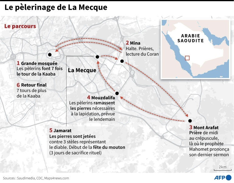 Le pèlerinage consiste en une série de rites religieux accomplis pendant cinq jours dans la ville la plus sacrée de l'islam et ses environs, dans l'ouest de l'Arabie saoudite. Les pèlerins se rendront jeudi à Mina, à environ cinq kilomètres de la Grande Mosquée, avant le rite principal au Mont Arafat, où le prophète Mahomet aurait prononcé son dernier sermon.