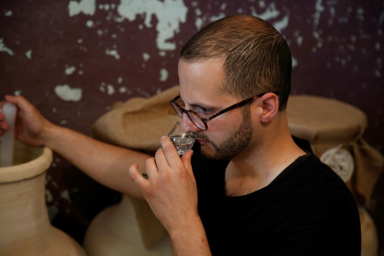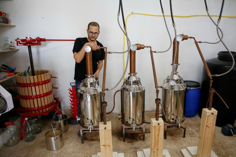 Cet homme de 35 ans travaille seul dans un sous-sol étroit, en utilisant des raisins fermentés de sa région, la Cisjordanie occupée, pour produire cette boisson courante en Turquie et au Proche-Orient qui rappelle l'ouzo grec ou le pastis français.