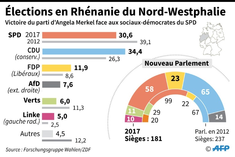 En 2012 le parti de Merkel était distancé de 13 points. "C'est un jour noir (...) le boxer SPD a pris un crochet au foie mais il tient encore debout", a réagi Ralf Stegner un des patrons des sociaux-démocrates allemands en référence à la bataille pour la chambre des députés qui s'annonce très difficile. "On aborde la campagne des législatives en confiance, le vent en poupe. C'est pour cela que (l'élection) en Rhénanie du Nord-Westphalie est un succès énorme", a relevé à l'inverse très satisfait Michael Grosse-Brömer, haut responsable de la CDU.