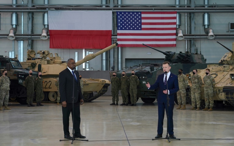 A l'occasion de la visite du secrétaire américain à la Défense Lloyd Austin et de son homologue polonais Mariusz Blaszczak, des véhicules blindés avaient été exposés dans un hangar géant de cette base où se trouvent un millier de soldats américains.
