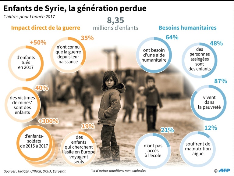 Alors que le conflit entrera jeudi dans sa huitième année, une responsable de l'ONU a dénoncé mardi devant le conseil des droits de l'Homme à Genève une "monstrueuse indifférence" à l'égard des souffrances de millions d'enfants en Syrie. Kate Gilmore a en particulier exprimé son inquiétude pour les quelque 125.000 enfants du fief rebelle dans la Ghouta orientale, "dont beaucoup souffrent de malnutrition grave" et qui sont pour la plupart "profondément traumatisés".