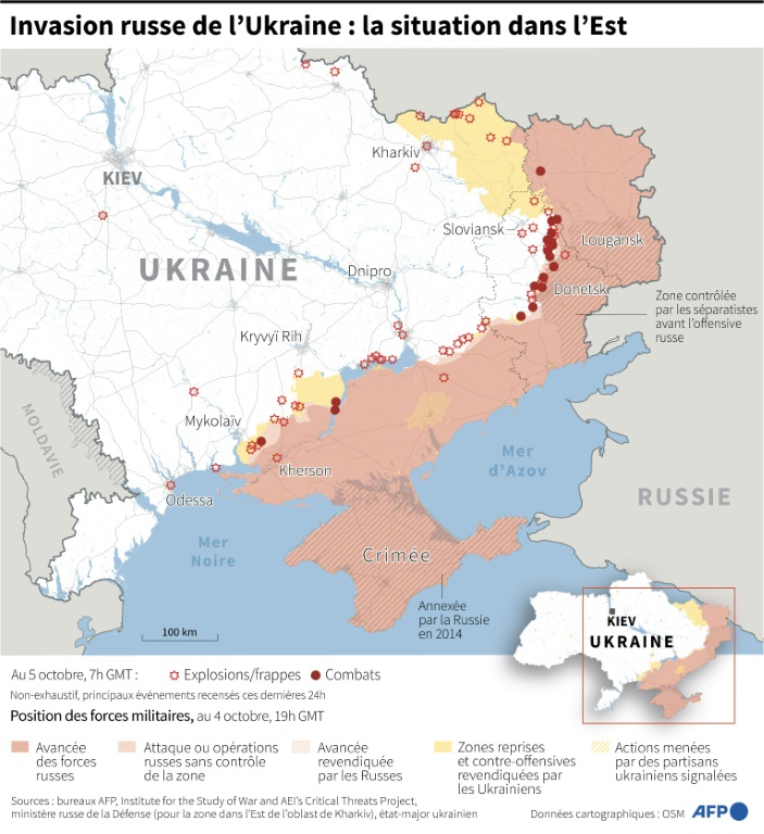 L'armée russe avait reconnu à demi-mot des retraites mardi, en publiant des cartes des territoires qu'elle contrôle. Celles-ci montrent que Moscou a cédé toute une partie du nord de la région de Kherson et qu'elle avait quitté presque toute la rive orientale de la rivière Oskil, dernière zone de la région de Kharkiv qu'elle contrôlait encore.