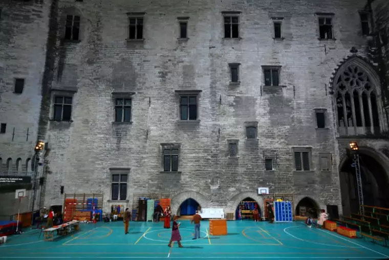 Pour l'occasion, la Cour d'honneur a été transformée en centre d'aide sociale, avec un terrain de basket au milieu, des banquettes, des armoires et des matelas autour, a constaté une journaliste de l'AFP sur place.
