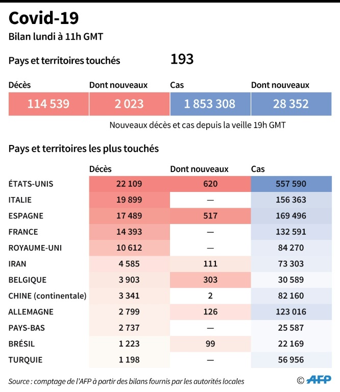 La pandémie de nouveau coronavirus a fait au moins 114.539 morts dans le monde depuis son apparition en décembre en Chine, selon un bilan établi par l'AFP à partir de sources officielles lundi à 11H00 GMT.