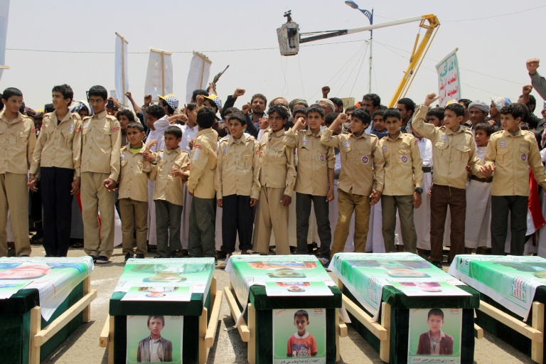 La cérémonie, encadrée par des combattants Houthis, a donné lieu à une manifestation au cours de laquelle des milliers de partisans des insurgés ont dénoncé tour à tour l'Arabie saoudite, les Etats-Unis et les autres membres de la coalition.Au début des funérailles, les cercueils, recouverts d'un tissu vert, couleur symbole du martyre, et des portraits des jeunes victimes, ont été alignés au sol pour la prière des morts.