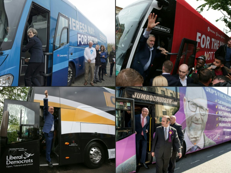 Le slogans apposés sur les bus de campagne ont tendance à être courts. Sur le bus des conservateurs "Theresa May: For Britain"(Theresa May pour la Grande-Bretagne); sur celui des travaillistes "For The Many Not The Few" (Pour le plus grand nombre, pas pour une minorité).
