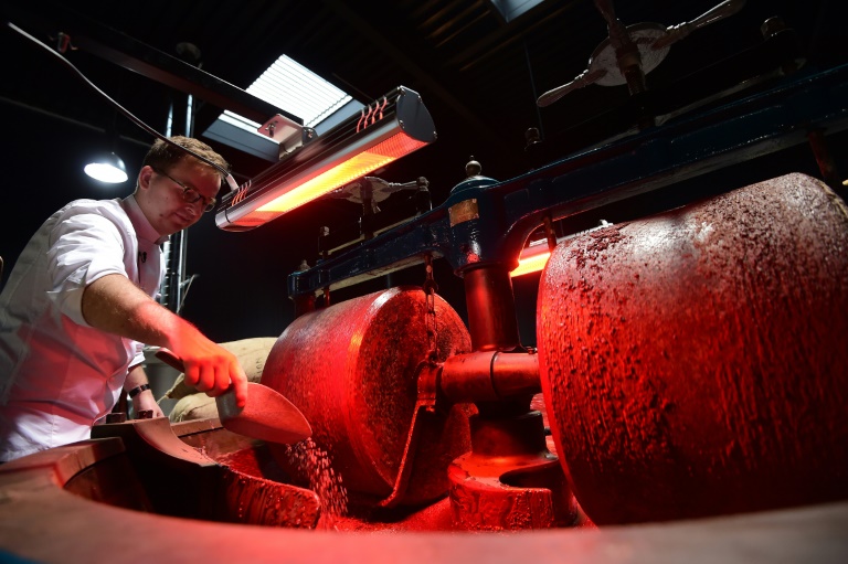 L'autre, pour broyer, comprend deux énormes roues de granit qui transforment le grué (l'éclat de la fève, une fois torréfiée et concassée) en liqueur de chocolat, base de toute recette. Elle a été fabriquée au 19e siècle, servait de décoration dans le hall d'une usine en Grèce et a été rafistolée grâce au savoir-faire des ouvriers wallons.