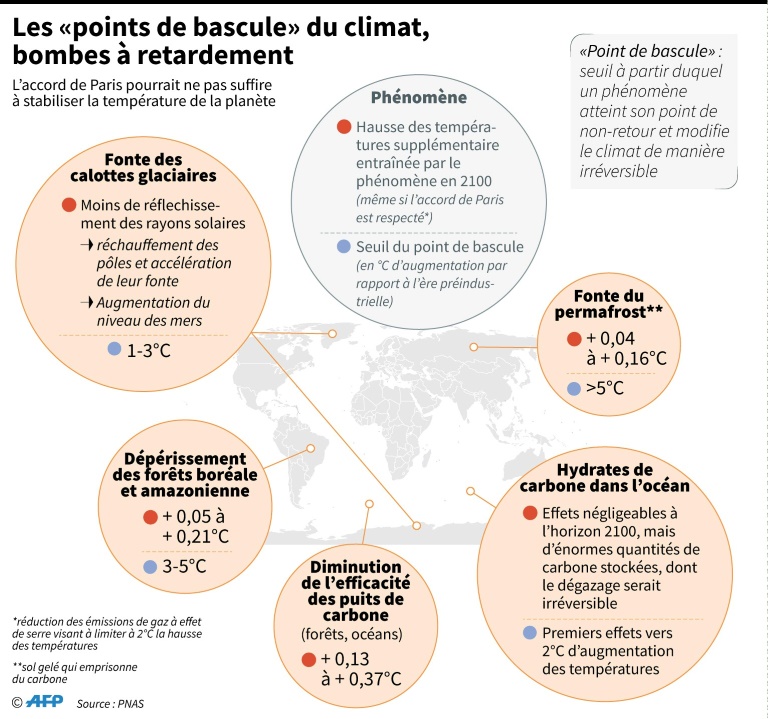 Les chercheurs suggèrent que le point de rupture pourrait être atteint lorsque la température de la Terre sera supérieure de 2 degrés à celle de l'ère préindustrielle. Elle l'est déjà d'un degré et continue d'augmenter à un rythme de 0,17 degré par décennie. "Un réchauffement de 2 degrés pourrait activer d'importants éléments de rupture, augmentant ainsi encore davantage la température ce qui pourrait activer d'autres éléments de rupture par un effet domino qui pourrait entraîner la Terre vers des températures encore plus élevées", prévient le rapport. Les experts s'inquiètent également de phénomènes comme les feux de forêts qui se multiplieraient à mesure que la planète se réchauffe et s'assèche.
