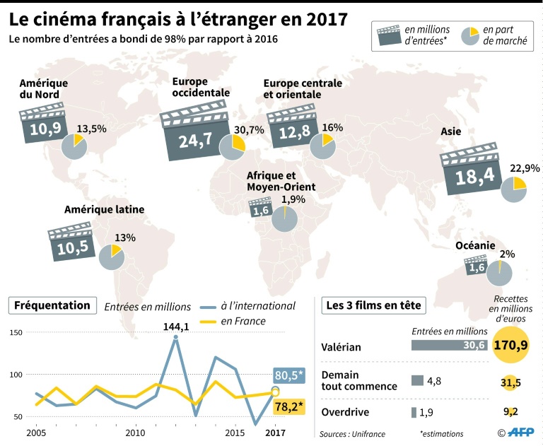 En 2017, le film de science-fiction "Valérian et la Cité des mille planètes" a ainsi contribué à relancer la machine. Le dernier opus de Luc Besson, inspiré de la bande dessinée "Valérian et Laureline", a fait moins bien qu'attendu mais a quand même attiré 30,6 millions de personnes à l'étranger, dont un tiers en Chine. Il a attiré 4,7 millions de spectateurs aux Etats-Unis et sur le marché anglophone du Canada et 3,2 millions en Russie. Il a aussi été vu par quatre millions de personnes en France.