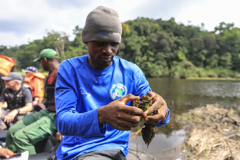 Et c'est grâce aux pêcheurs locaux qu'il a appris à les détecter dans les 4.500 hectares d'eaux sombres du lac Ossa, dans un parc naturel du sud-ouest du Cameroun.