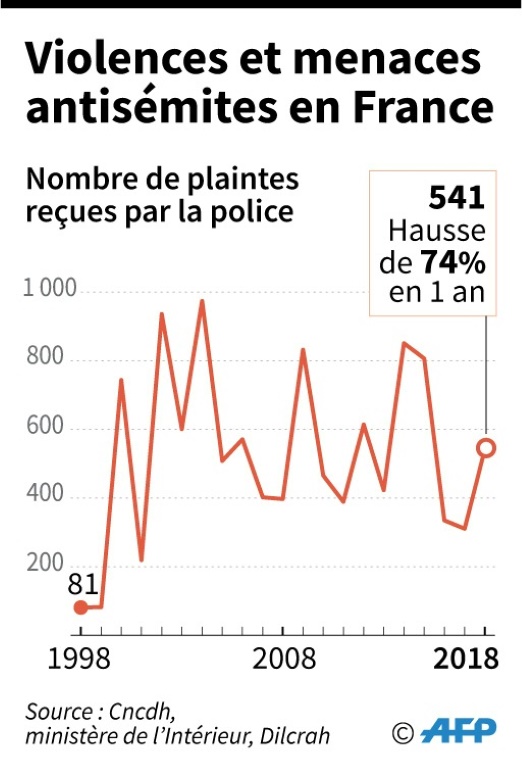 Une semaine plus tôt, le ministre de l'Intérieur Christophe Castaner annonçait en banlieue parisienne, sur le site où un arbre planté en mémoire d'Ilan Halimi, jeune juif tué en 2006, avait été vandalisé, que les actes antisémites avaient bondi de 74% en 2018 en France, avec 541 faits constatés.
