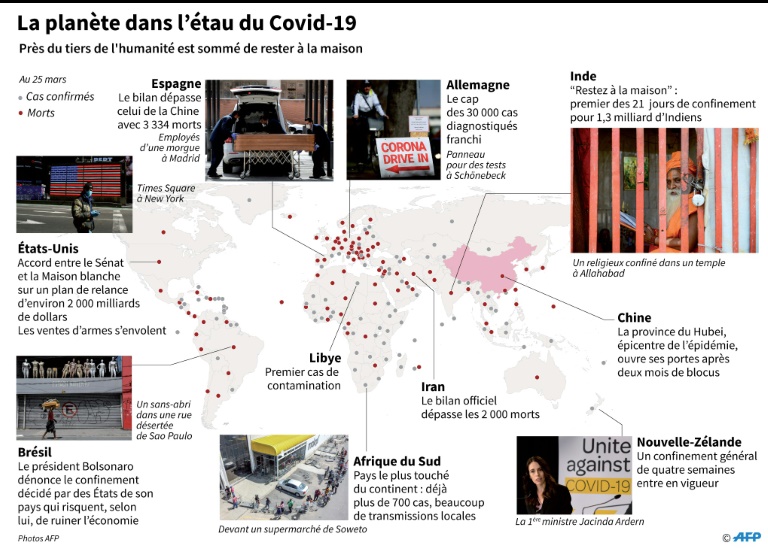 Face à la menace du coronavirus, "l'ensemble de l'humanité doit riposter. Une action et une solidarité mondiales sont cruciales", a souligné M. Guterres en lançant mercredi un "plan de réponse humanitaire mondial" destiné notamment à aider les pays les plus pauvres. De leur côté, FMI et Banque mondiale ont appelé les créanciers bilatéraux à geler les remboursements de dettes des pays les plus pauvres.