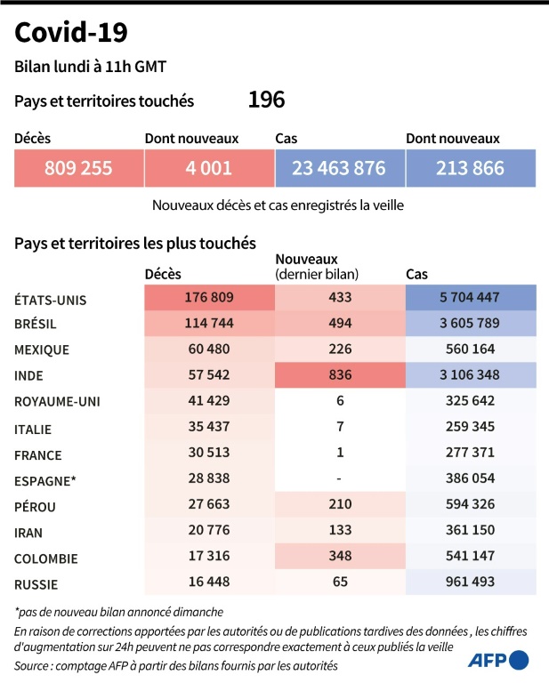 Plus de 23.463.870 cas ont été diagnostiqués dans 196 pays et territoires. Les États-Unis sont le pays le plus touché avec 176.809 décès. Suivent le Brésil avec 114.744 morts, le Mexique (60.480), l'Inde (57.542) et le Royaume-Uni (41.429).