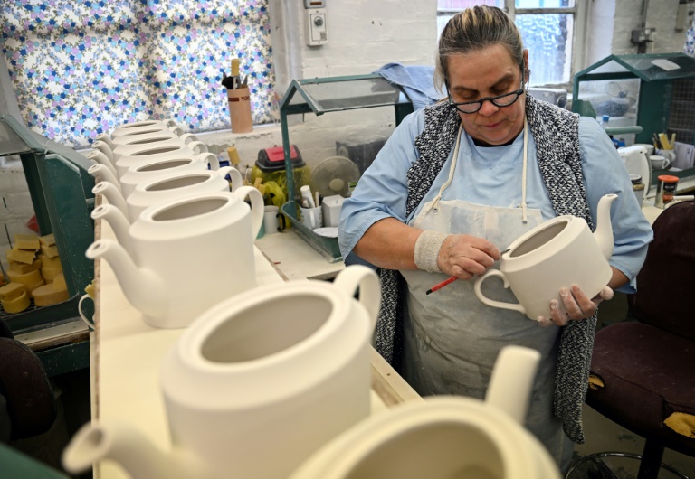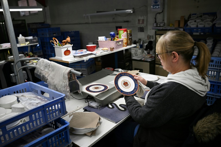 Avec son coup de pinceau expert, une artisane trace un trait fin doré autour d'une tasse, la touche finale sur cet objet créé pour célébrer le couronnement de Charles III, le premier d'un monarque britannique depuis 70 ans.