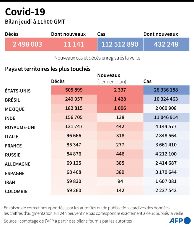 En attendant, les dirigeants de l'Union européenne devaient se réunir jeudi après-midi en sommet virtuel pour tenter d'afficher une stratégie commune face à la menace des variants du coronavirus, en dépit de restrictions à la circulation non coordonnées et de vives divergences sur le futur "passeport vaccinal".