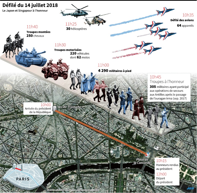 Après le président américain Donald Trump l'an dernier, le Premier ministre singapourien Hsien Loong et le ministre des Affaires étrangères japonais Taro Kono étaient cette année les invités d'honneur du défilé du 14 juillet.Les drapeaux des deux pays asiatiques ont ouvert le défilé aux côtés de l'emblème français, escortés par sept soldats de chaque nationalité.