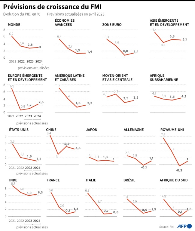 Le Fonds monétaire international (FMI) a légèrement révisé à la baisse sa prévision de croissance mondiale pour 2023 mais s'attend à ce que les principales régions économiques évitent la récession, selon les données publiées mardi à l'occasion de ses réunions de printemps à Washington.