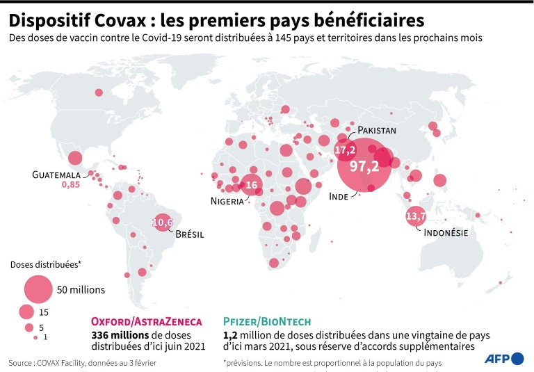 Fondé par l'OMS, l'Alliance du vaccin (Gavi) et la Coalition pour les innovations en matière de préparation aux épidémies (Cepi), Covax a conclu des accords avec des fabricants pour deux milliards de doses en 2021 et a la possibilité d'en acheter un autre milliard. Le Ghana est la première nation dans le monde à recevoir des doses de vaccin financées par cette initiative. Ce pays anglophone ouest-africain a enregistré 80.759 cas de coronavirus, dont 582 morts. Mais ces chiffres sont sous-évalués, comme dans de nombreux pays africains où le nombre de tests réalisés reste faible.
