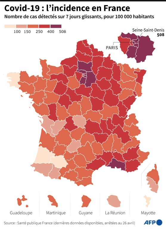 L'allègement se fera en quatre étapes, annoncées jeudi par M. Macron: lundi 3 mai (fin des restrictions de déplacement à 10 km, retour partiel des collégiens et lycéens en classe), 19 mai (couvre-feu repoussé à 21H00, réouverture limitée des commerces, cinémas, musées, théâtres et terrasses des bars), 9 juin (couvre-feu à 23H00, réouverture limitée des cafés et restaurants en intérieur) puis 30 juin (fin du couvre-feu), à la veille des vacances. Ces réouvertures inquiètent toutefois nombre de spécialistes, car les indicateurs de l'épidémie restent à un niveau élevé, malgré une lente décrue.