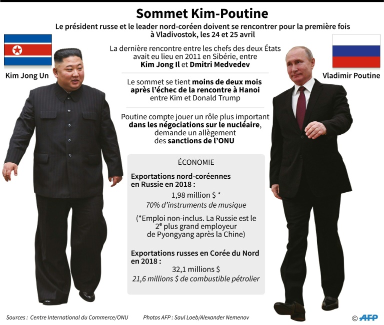 Il s'agira du premier sommet entre les chefs d'Etat des deux pays depuis que Kim Jong Il -- le père du dirigeant nord-coréen au pouvoir -- a rencontré Dmitri Medvedev, l'actuel Premier ministre russe alors président, il y a huit ans.
