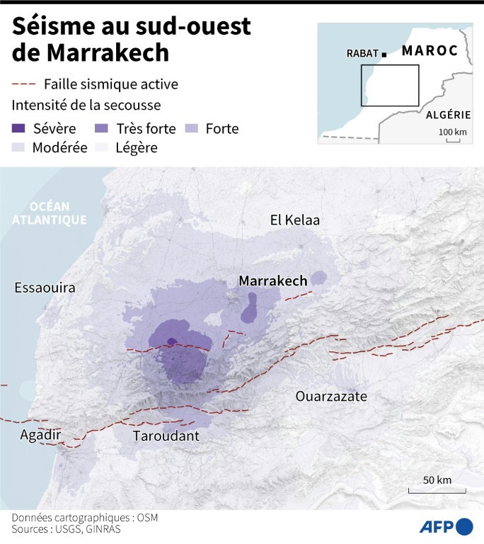 Le tremblement de terre de samedi, de magnitude 7 selon le Centre marocain pour la recherche scientifique et technique (6,8 selon le service sismologique américain), est le plus puissant à avoir jamais été mesuré au Maroc. Il a fait au moins 2.012 morts et 2.059 blessés, dont 1.404 sont dans un état très grave, a annoncé samedi soir le ministère de l'Intérieur.