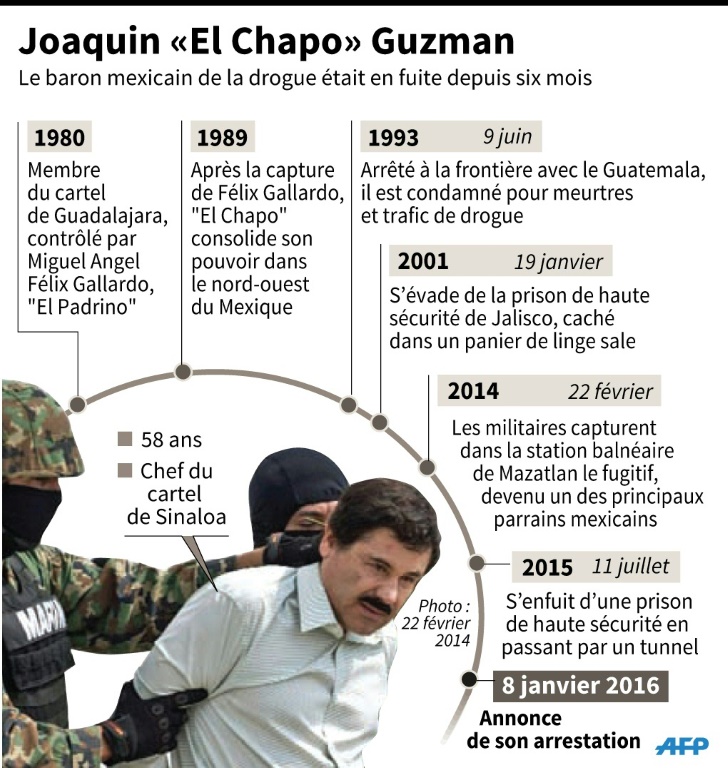 Simple petit paysan cultivant la marijuana, Joaquin "El Chapo" Guzman était devenu l'un des hommes les plus riches de la planète et le narcotrafiquant le plus recherché. Sa tête était mise à prix 3,8 millions de dollars (3,4 millions d'euros) par le gouvernement mexicain.